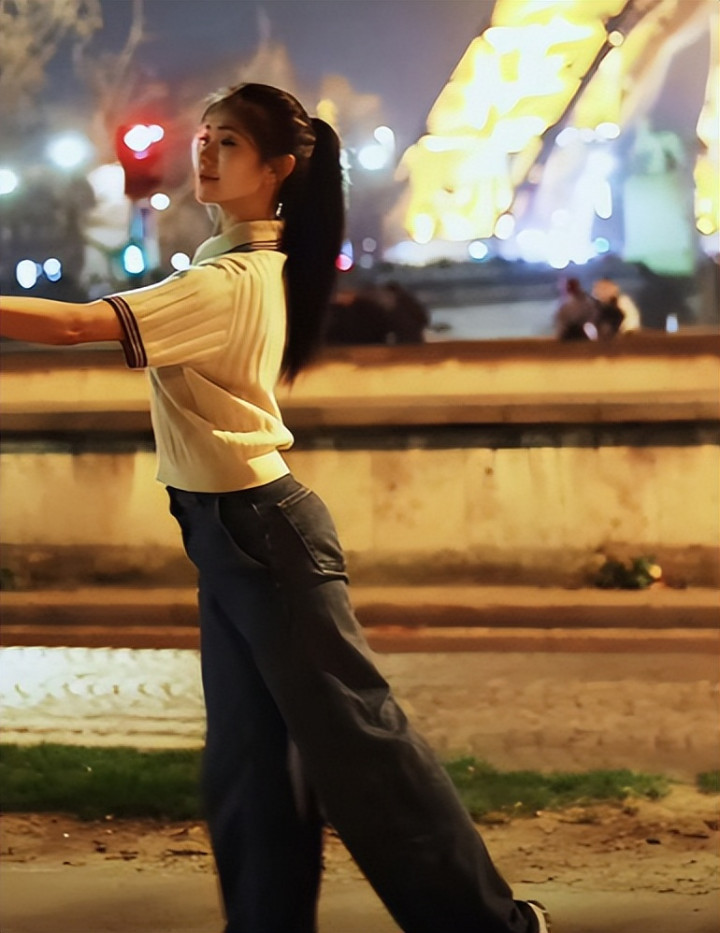 夜色中的埃菲尔铁塔亮着暖黄的灯光,她随着晚风即兴起舞,芭蕾的轻盈混着华尔兹的柔美,每一个动作都舒展又流畅。